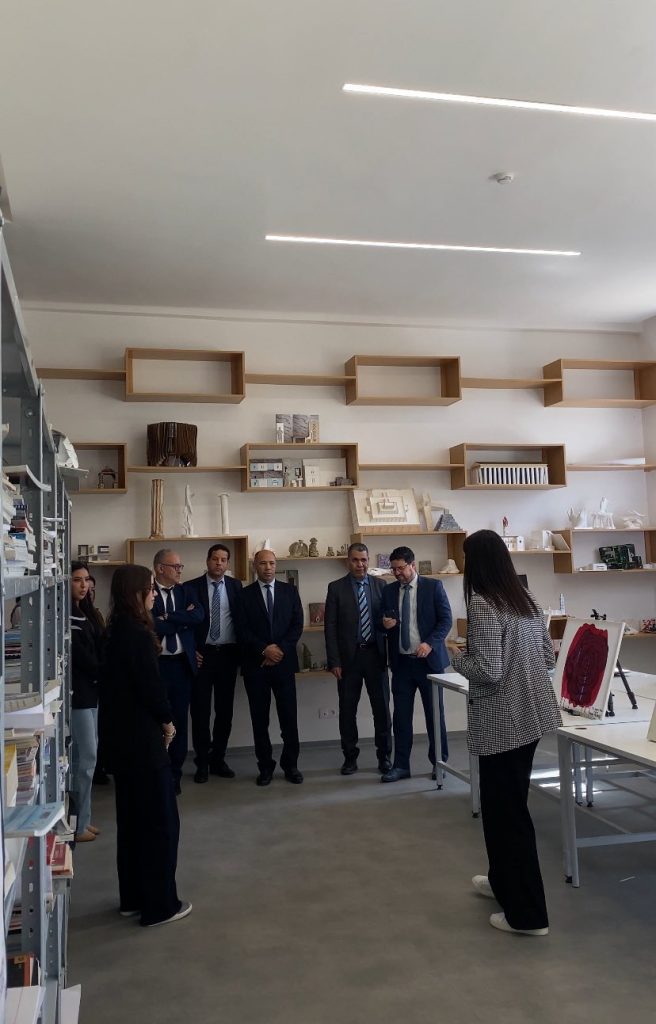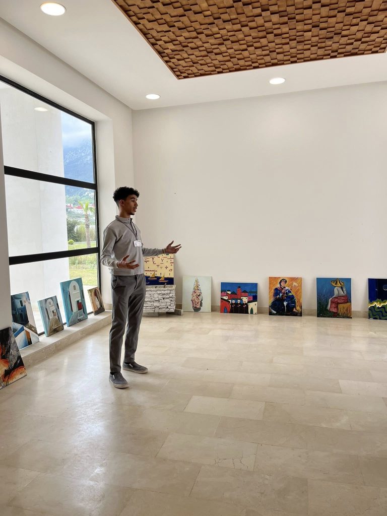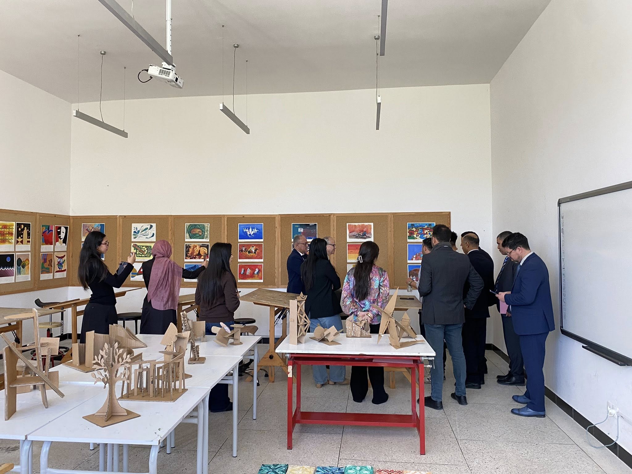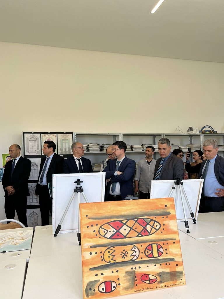 En parallèle, des travaux artistiques réalisés par les étudiants — dessins, peintures, pastels et aquarelles — ont été exposés, apportant une dimension artistique plus sensible au parcours. La visite s’est poursuivie par une découverte des espaces de l’école, permettant aux invités de mieux comprendre le cadre de formation et le quotidien des étudiants
